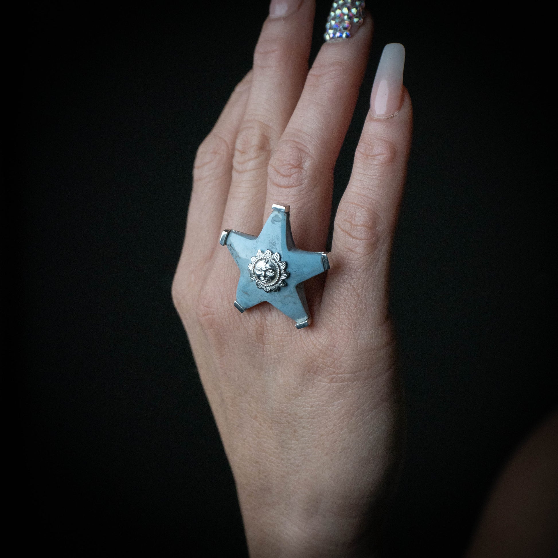 Anillo inspirado en numeración Maya, única pieza, piedra cielo con plata esterlina. Medida 8.5