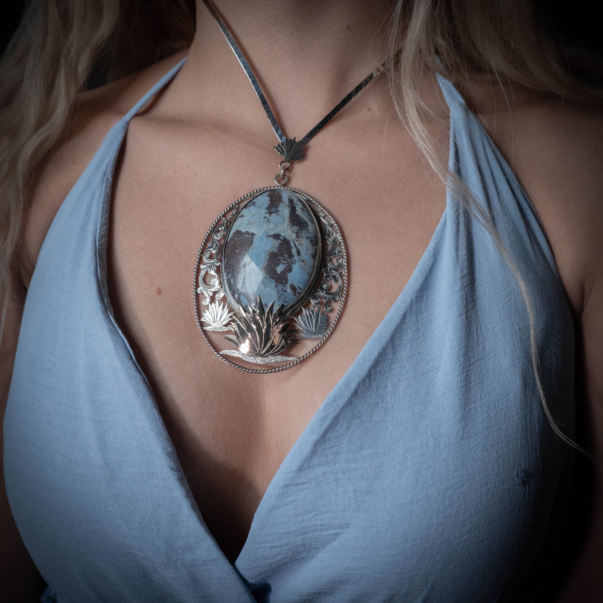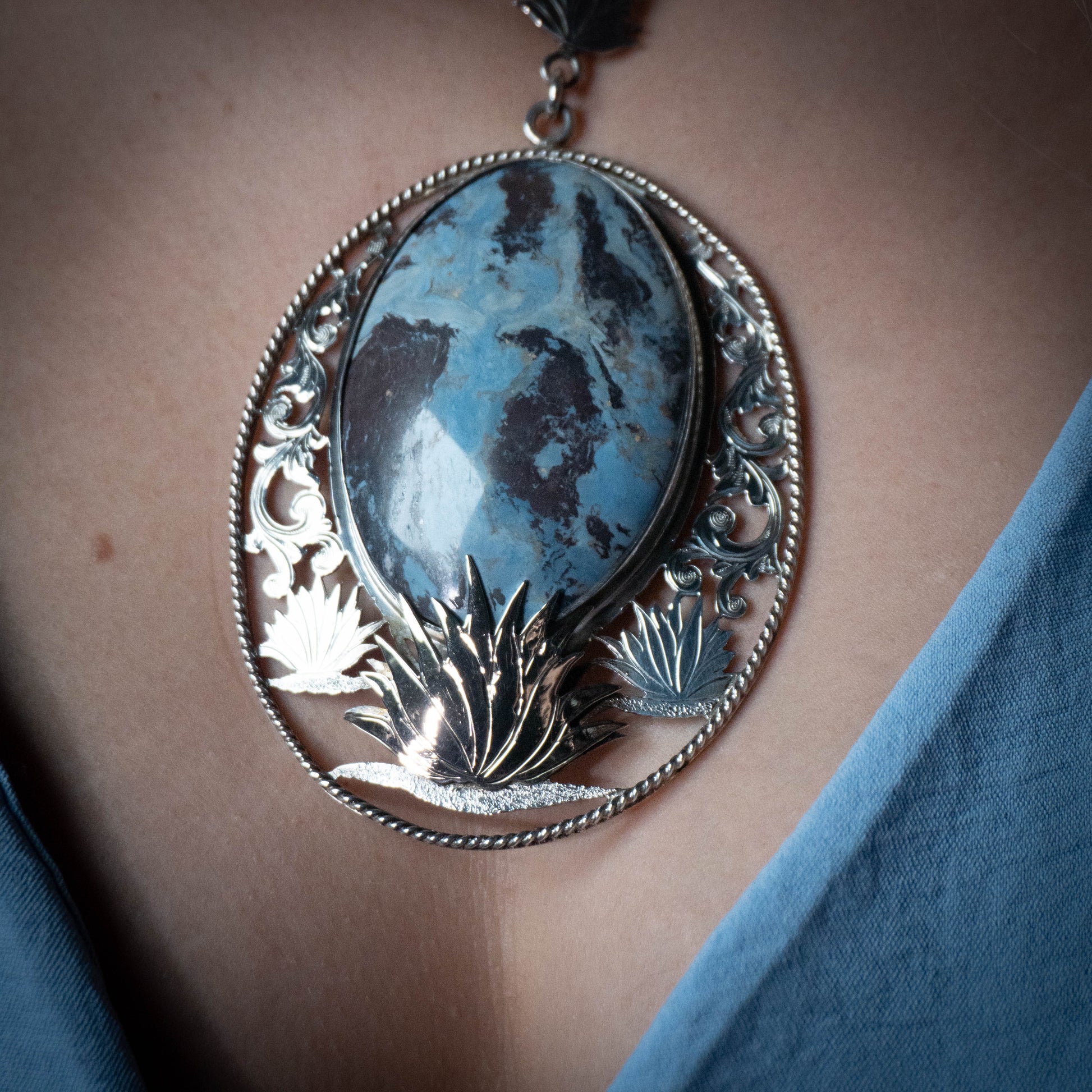 Dije de plata .925 con piedra cielo, medida 7.5 x 9.5 cm Pueza única colección Agave.