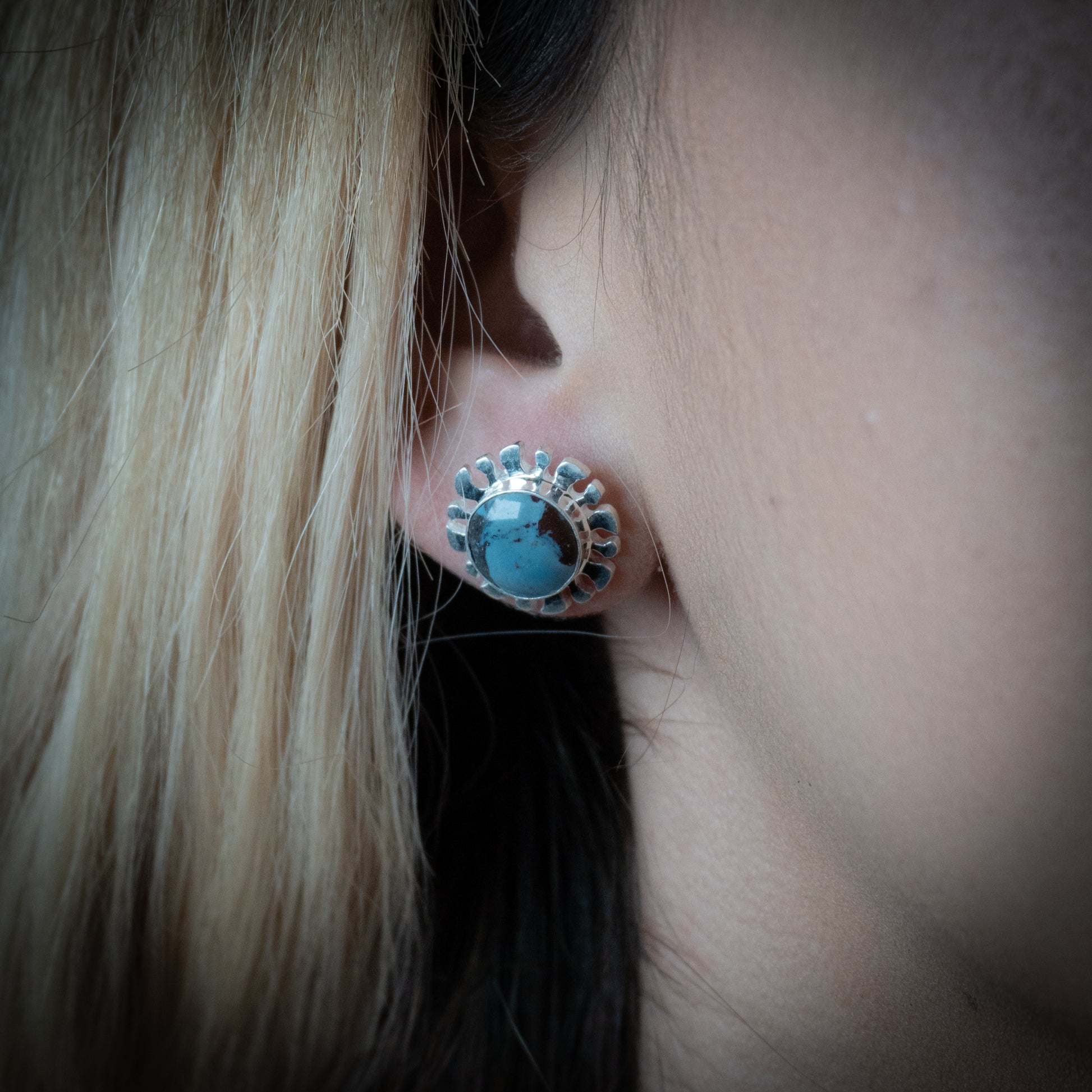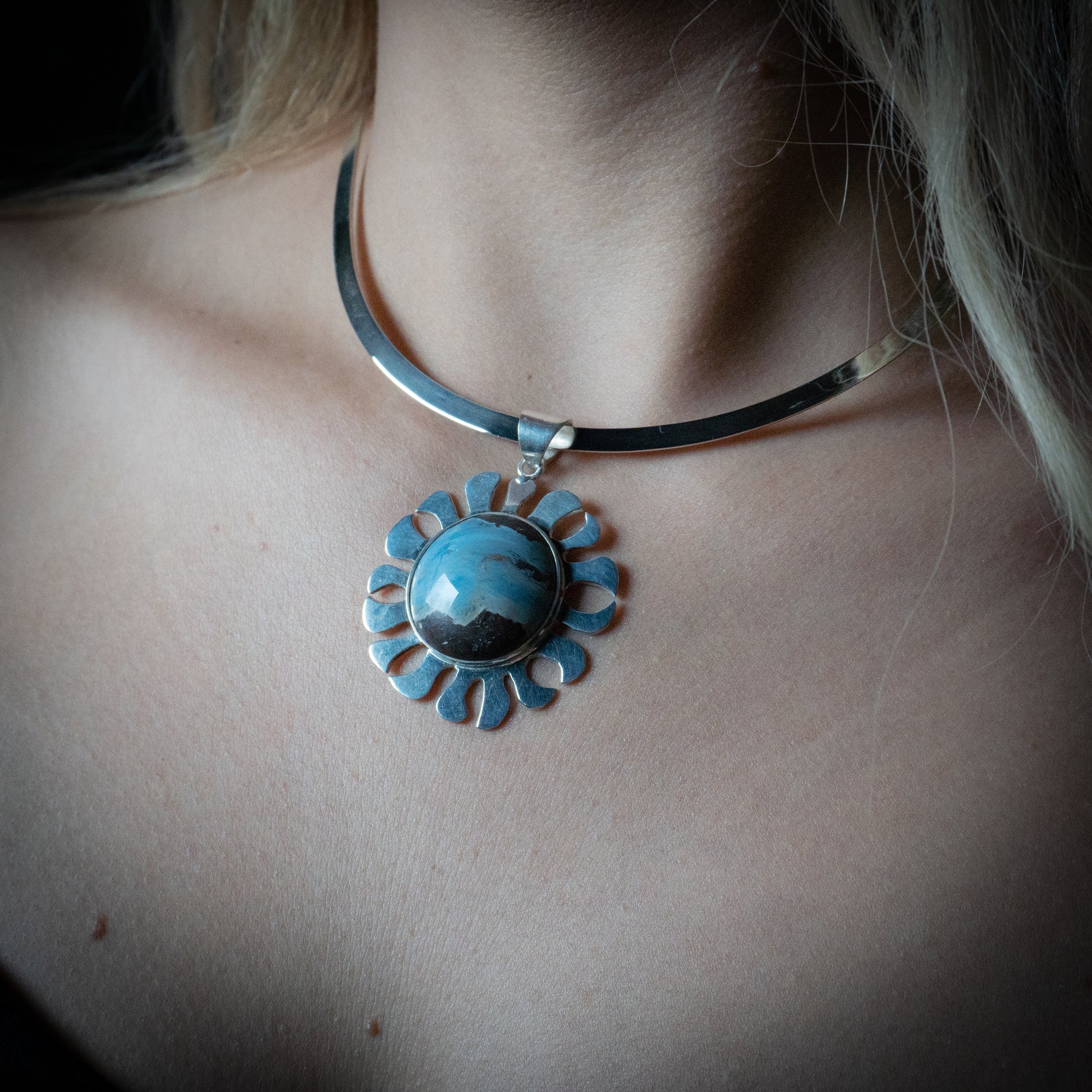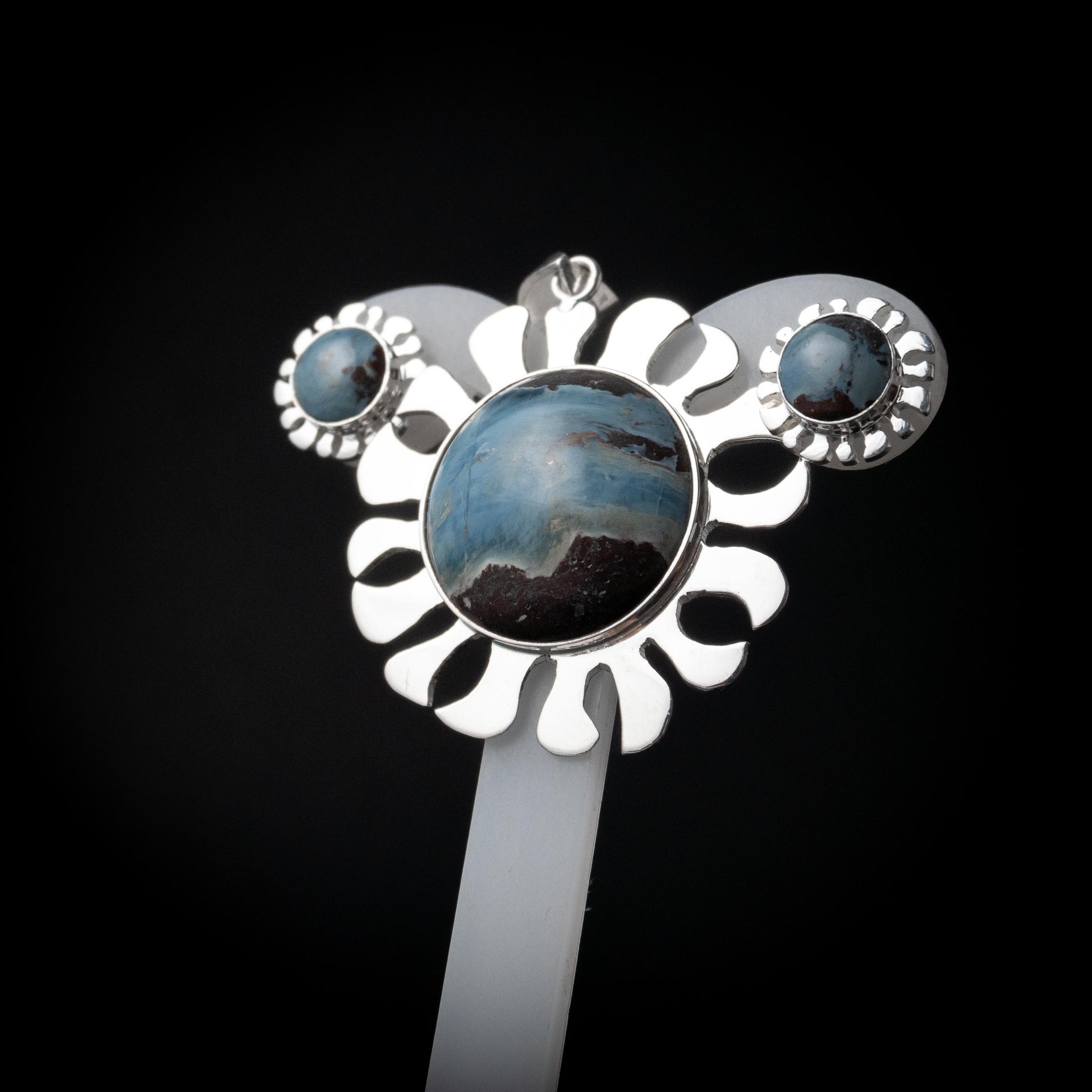 Conjunto de aretes y dije en forma esférica con detalles de plata esterlina.
