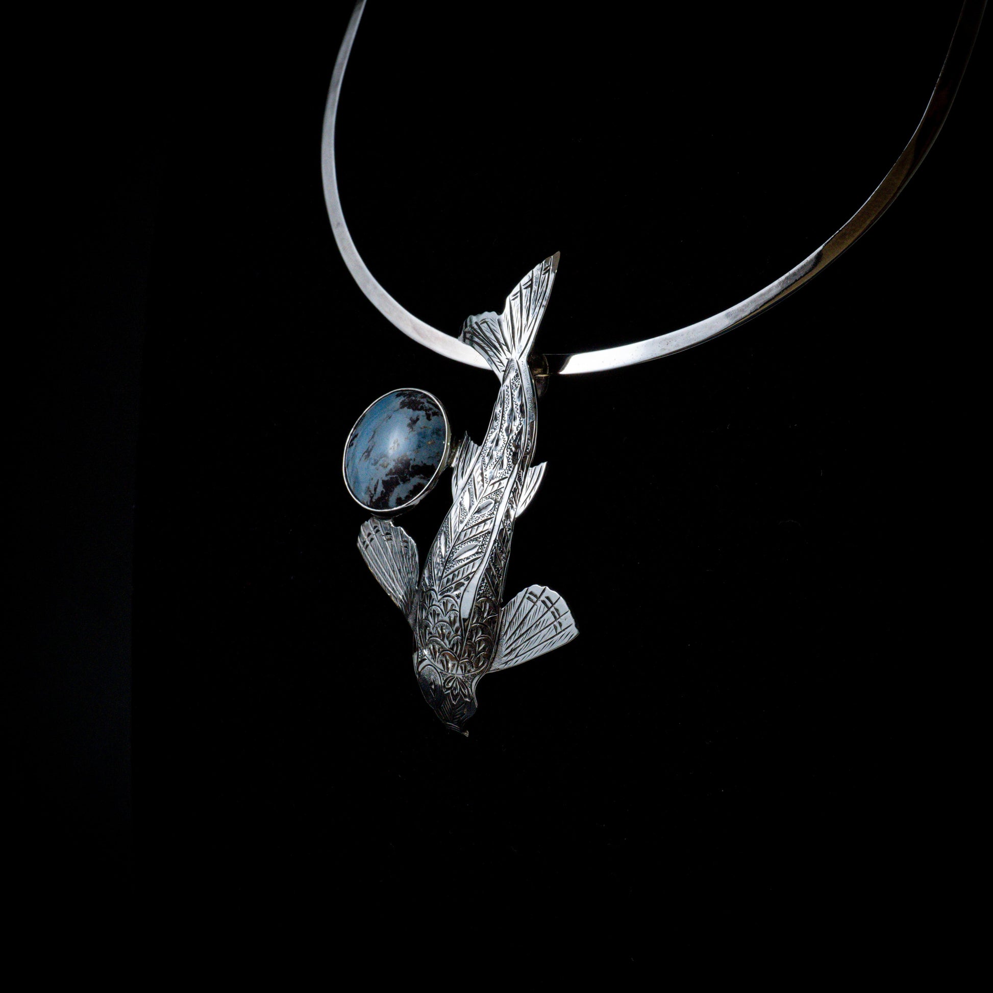 Pieza de plata esterlina con incrustación de piedra cielo en tono celeste con corte oval, detalle a mano. Pieza única. No incluye Gargantilla de plata. Medida aproximada de 8.3 cm x 5 cm.