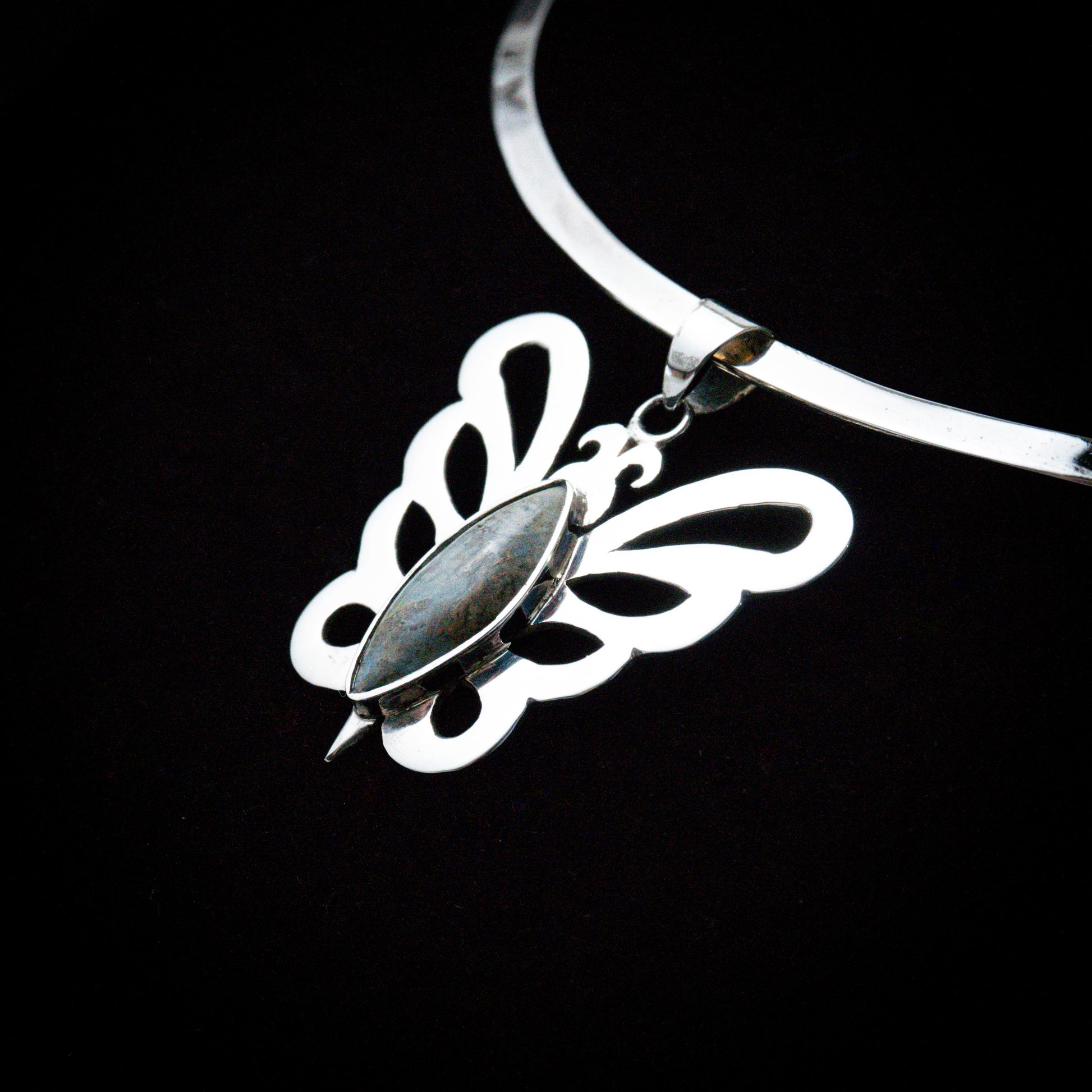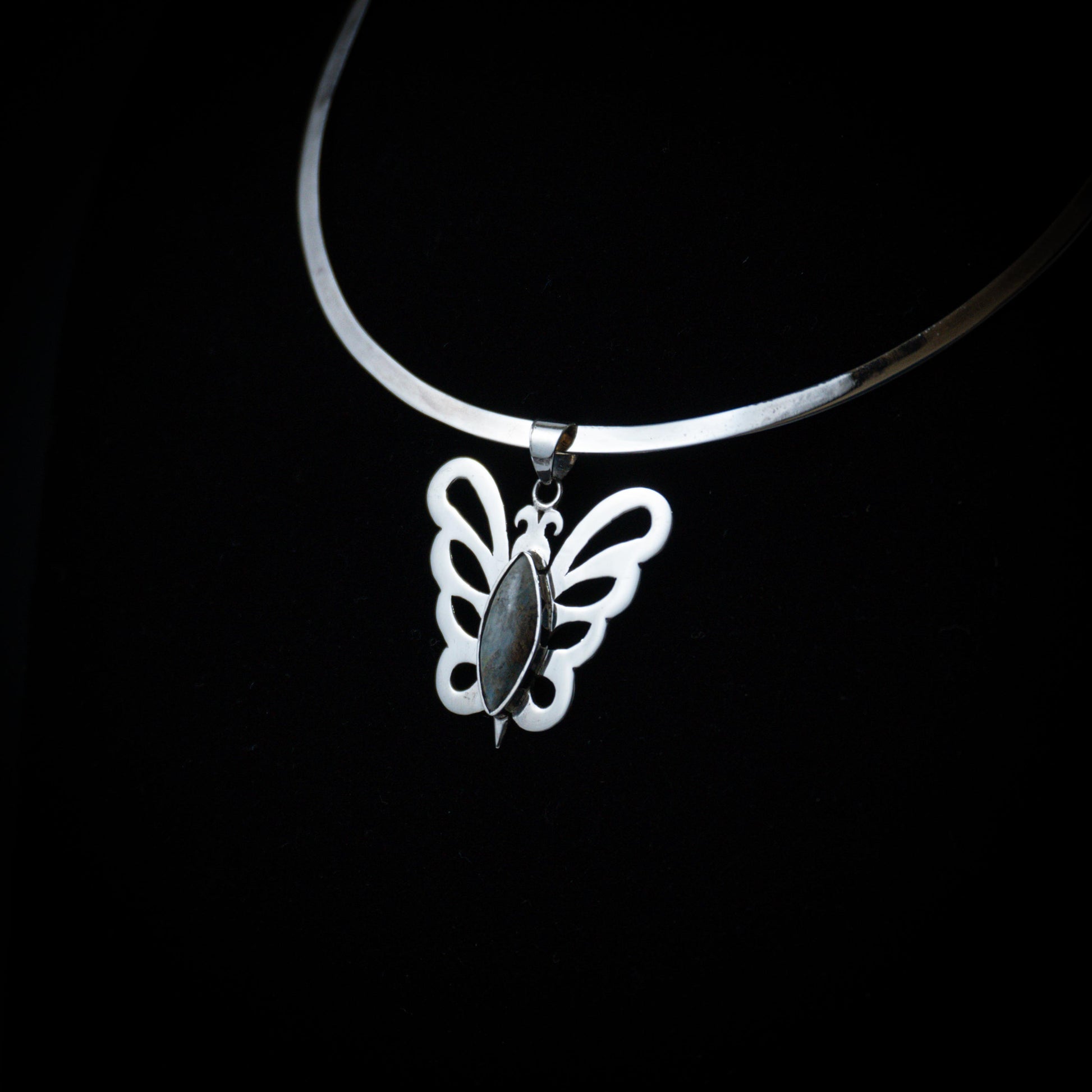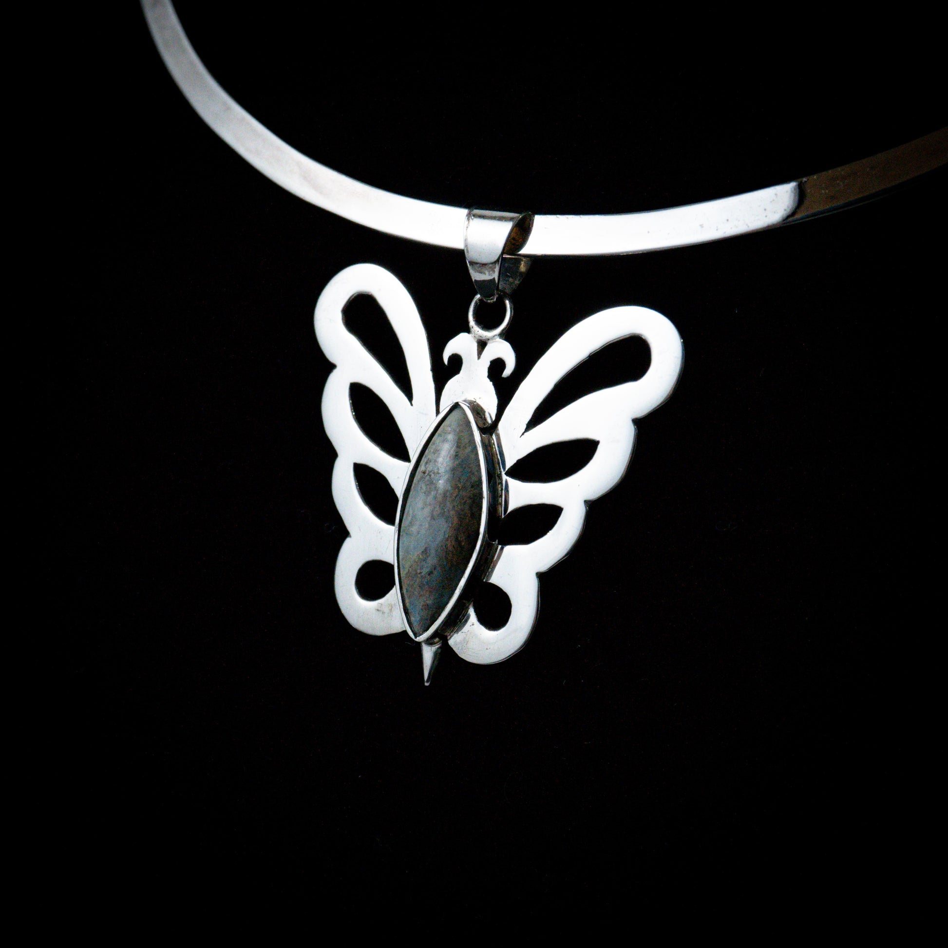 Mariposa Piedra cielo con plata .925 mide aprox 3X3.2cm, no incluye gargantilla.