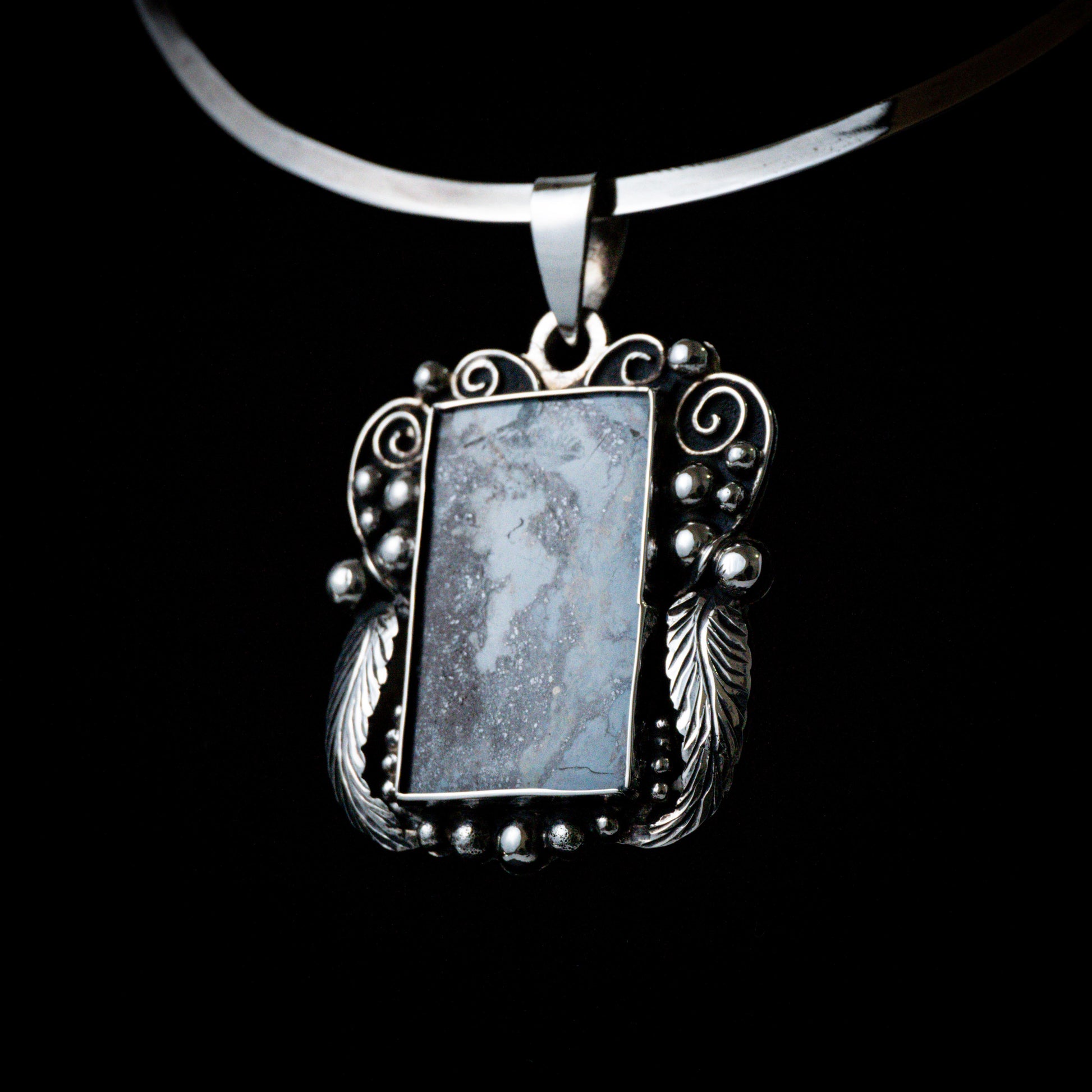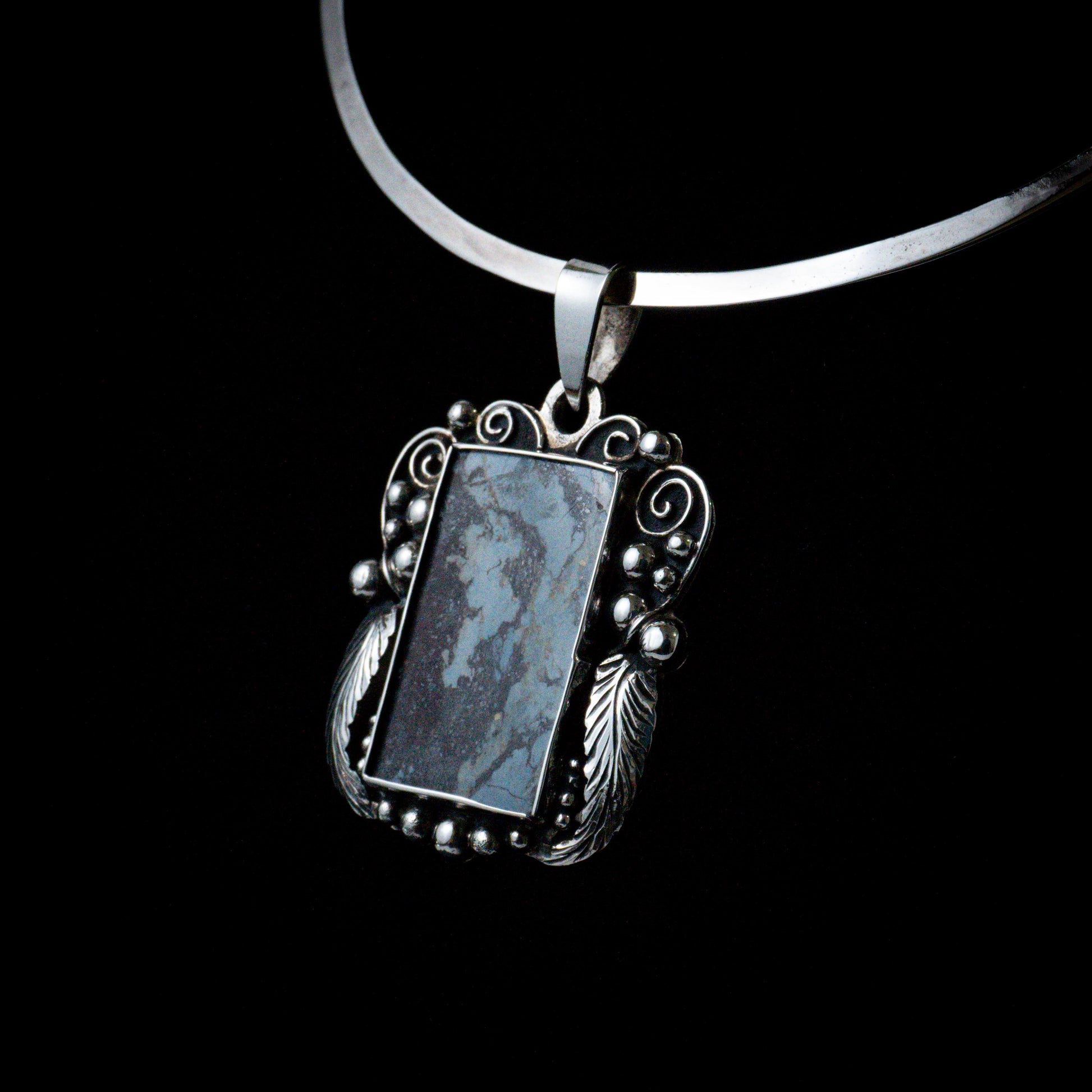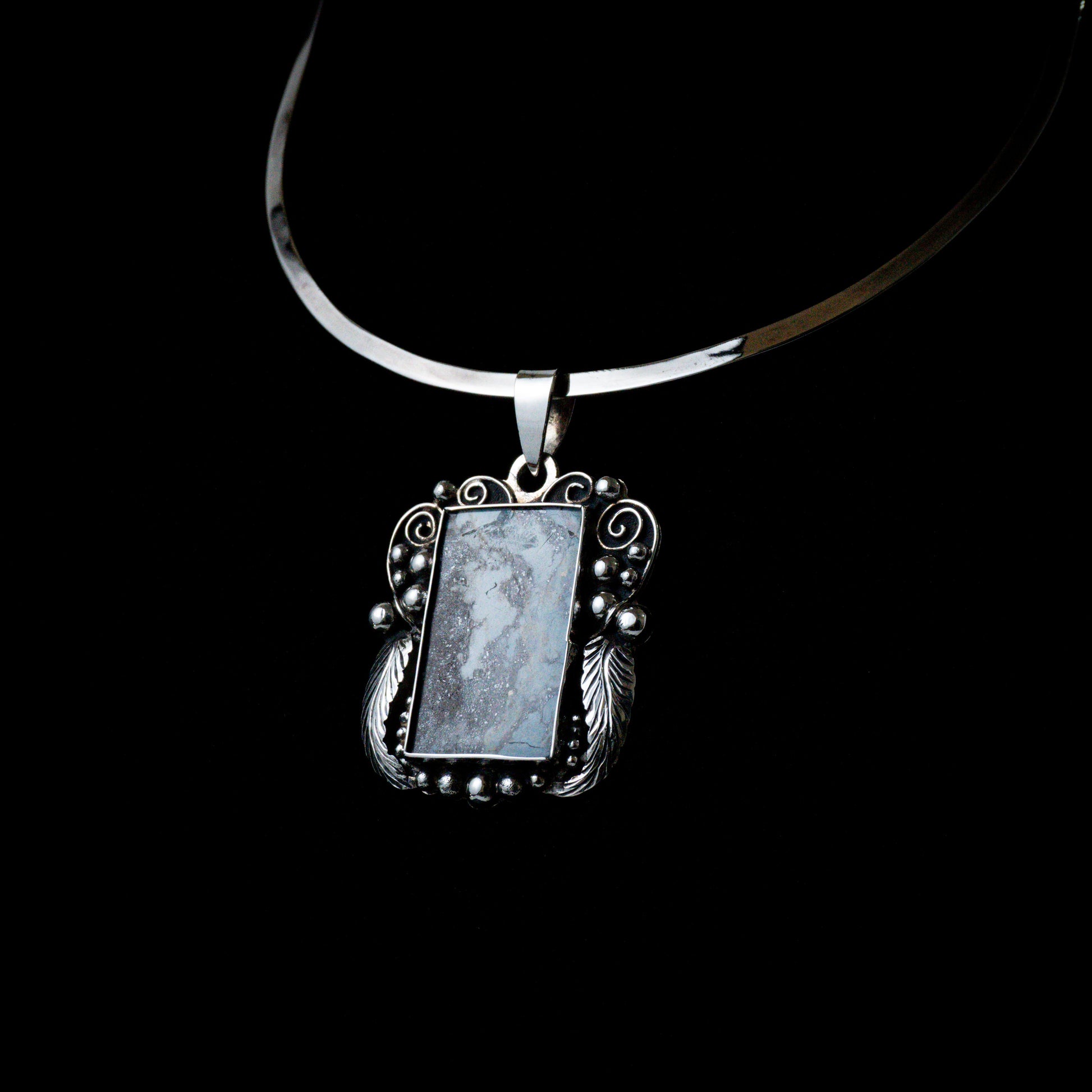 Pieza de piedra cielo con ornamentos en plata esterlina. 2.6 pulgadas X 1.9 pulgadas, no incluye gargantilla.